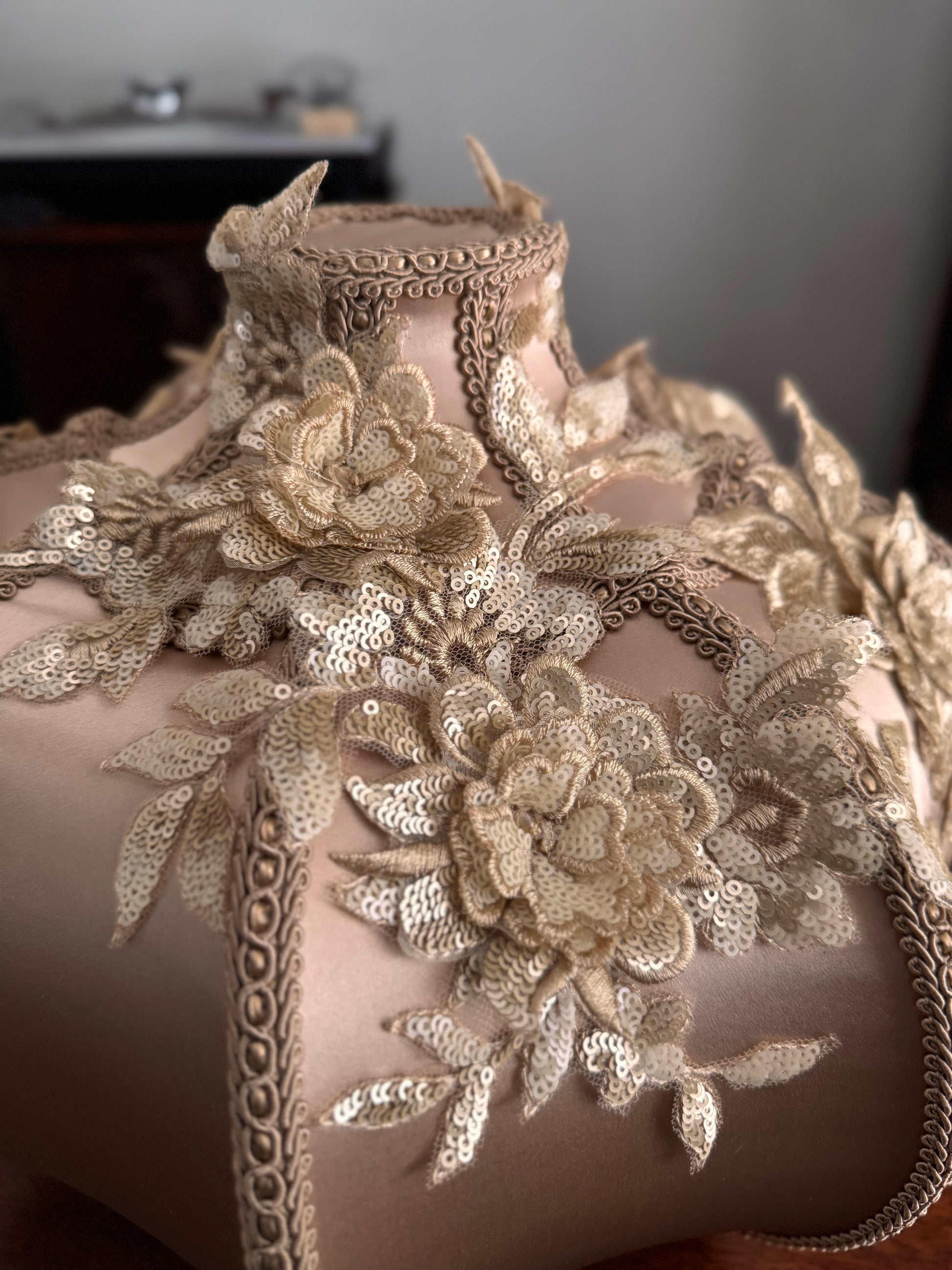 Hand stitched shade made with silk charmeuse and embroidered appliqués.
